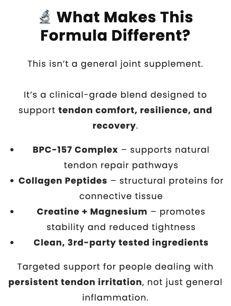This formula is designed to support tendon comfort and recovery through simple daily use, without the complexity seen in peptide forums.